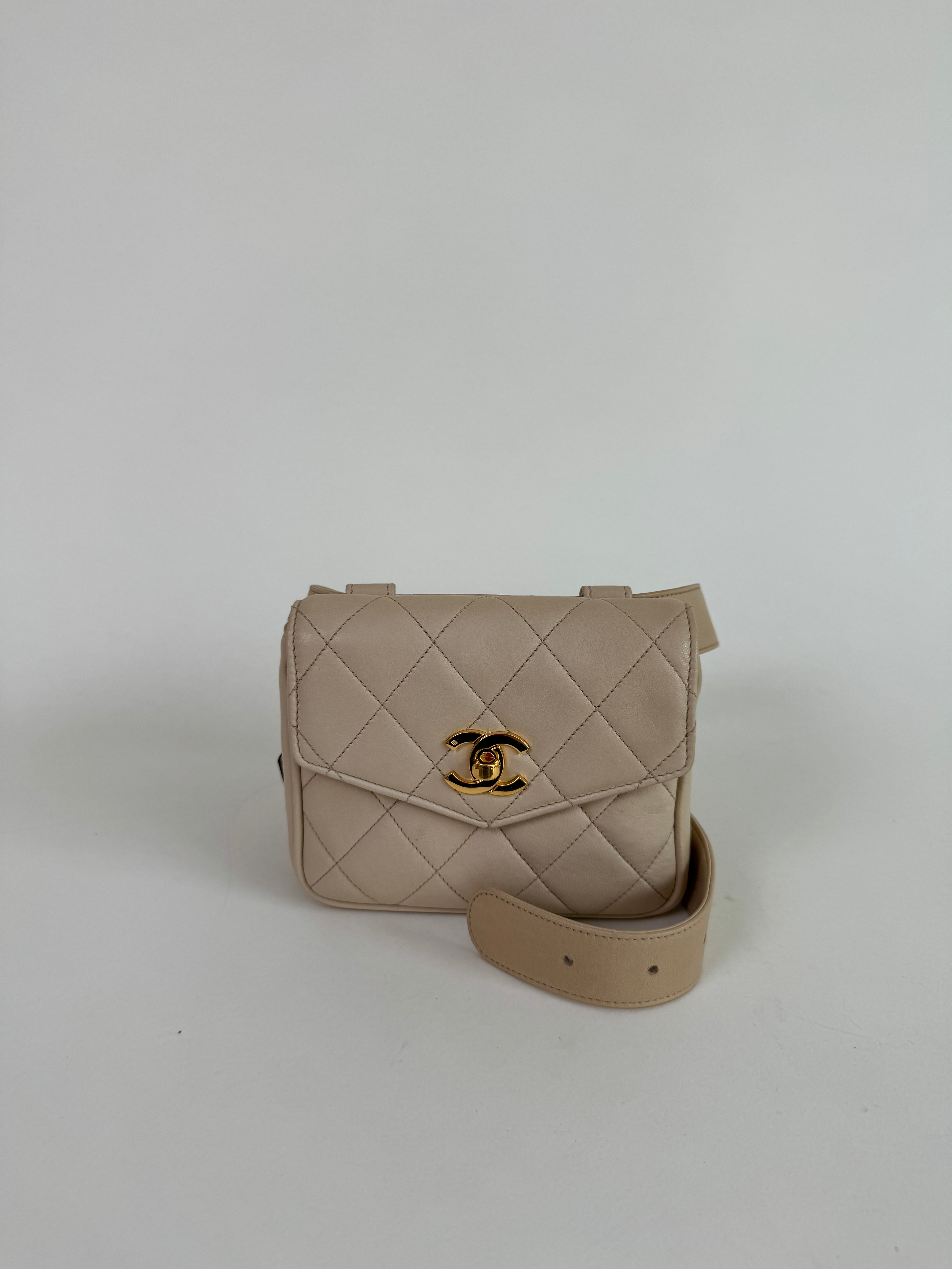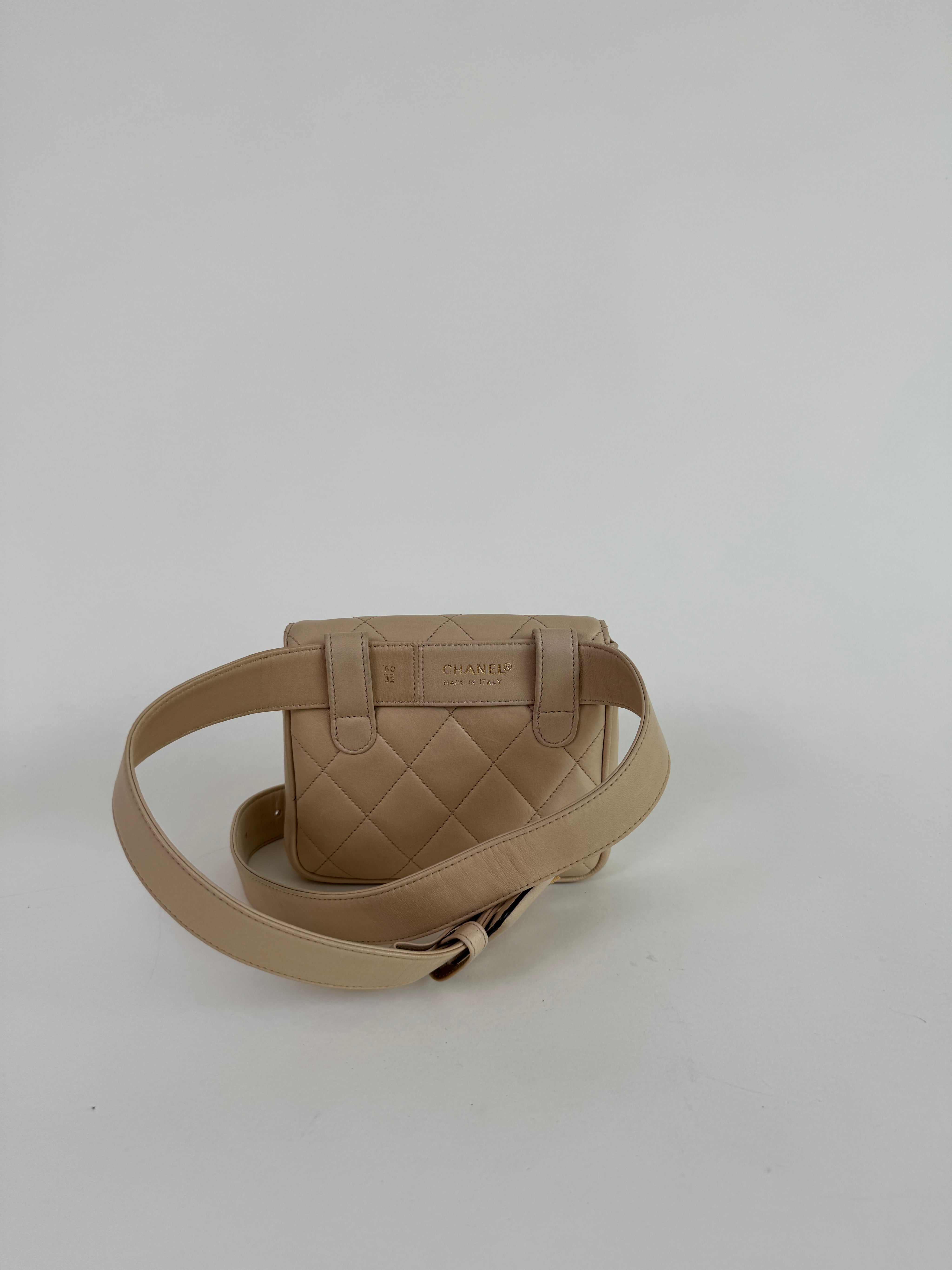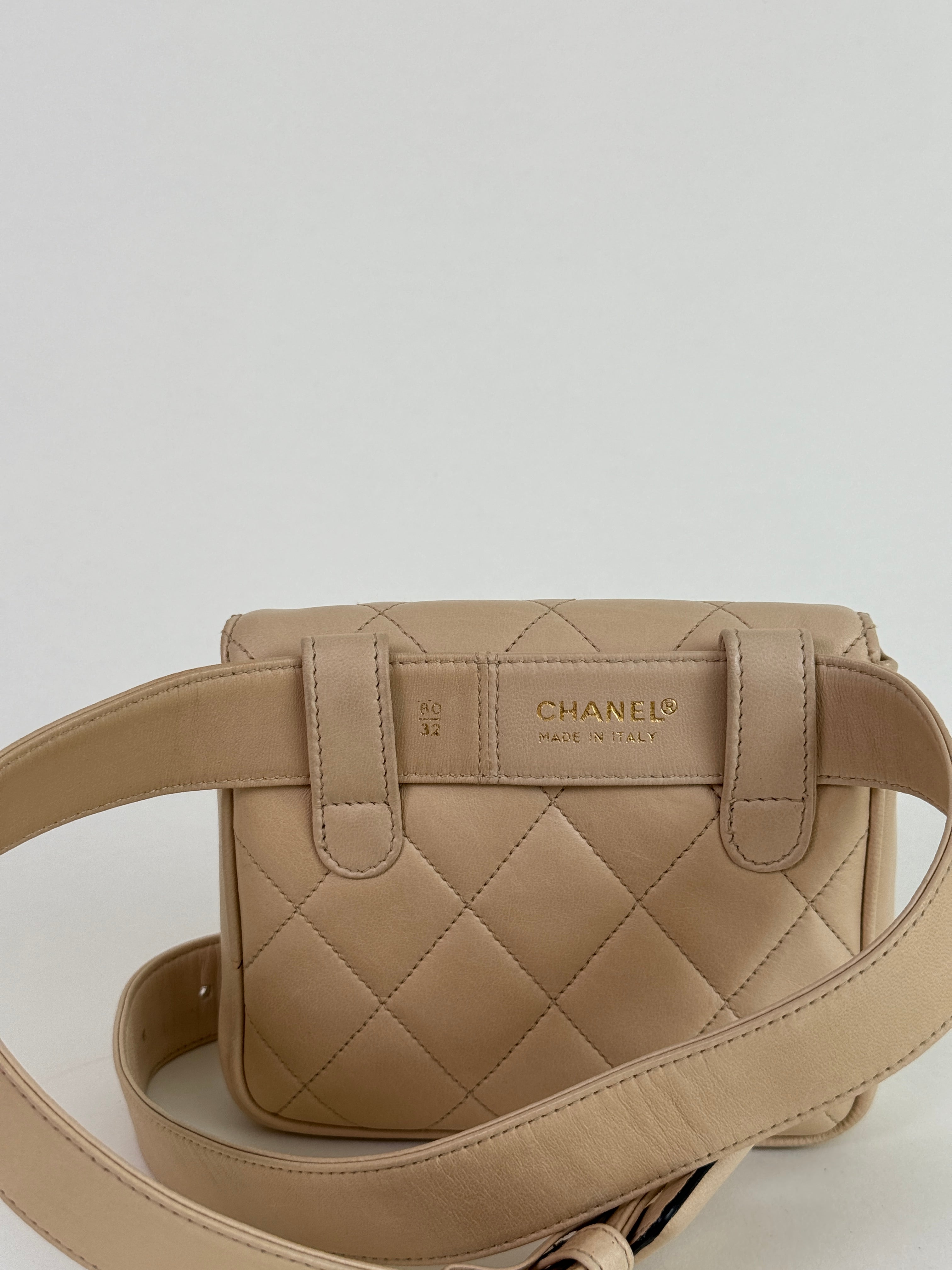 View Similar ProductsFeatures quilted beige leather with flap, CC logo turn-lock closure, and leather belt.