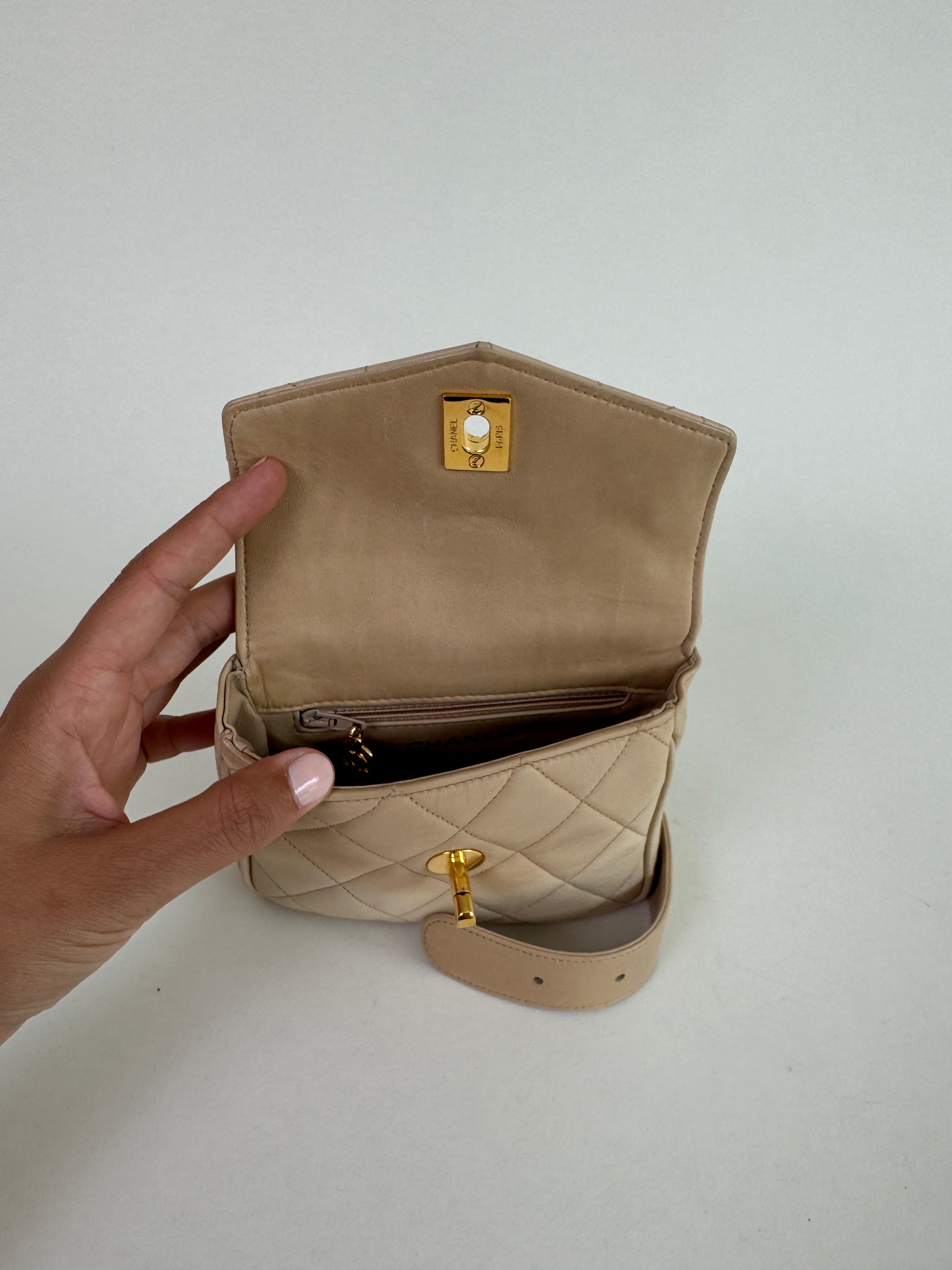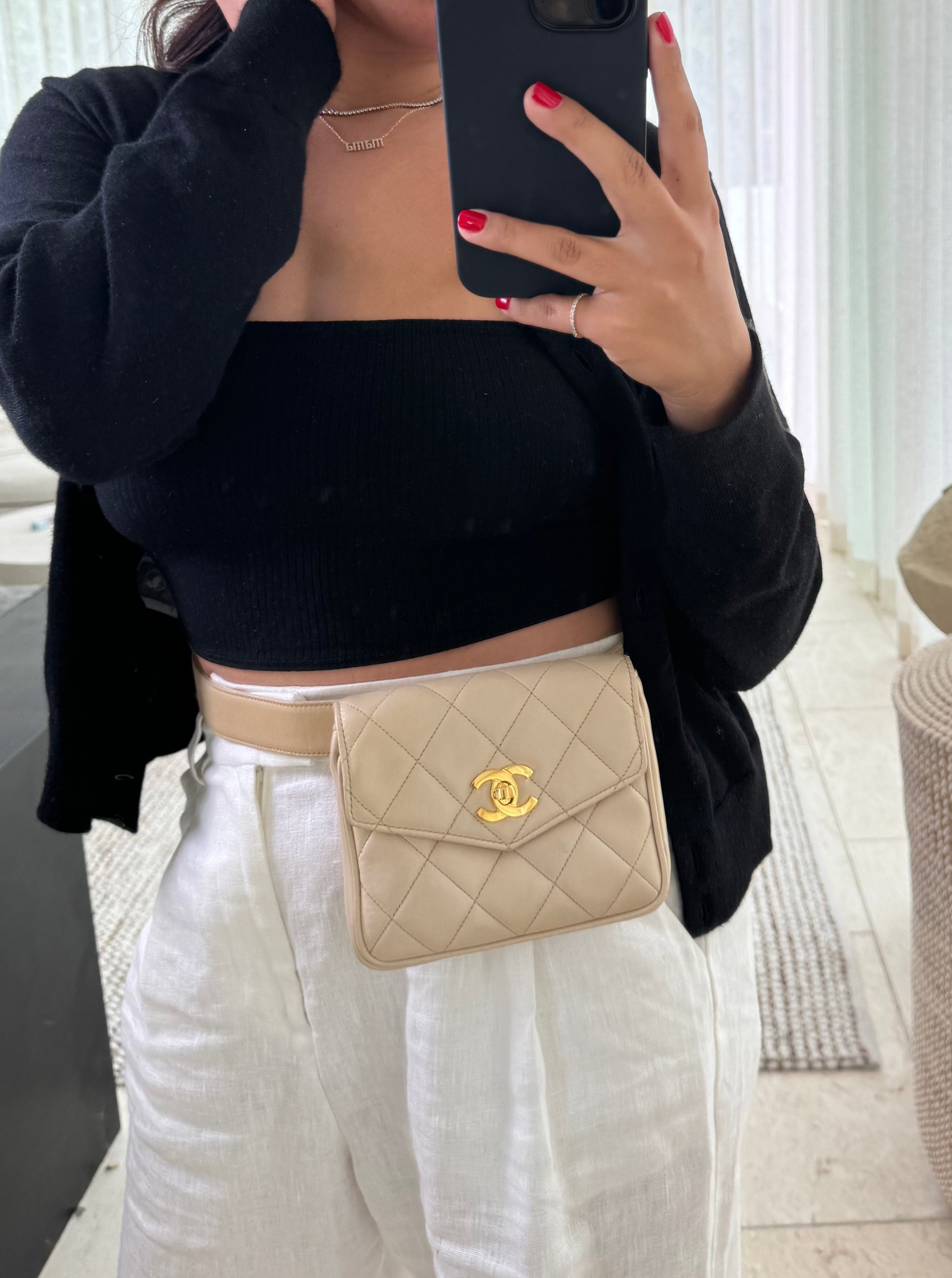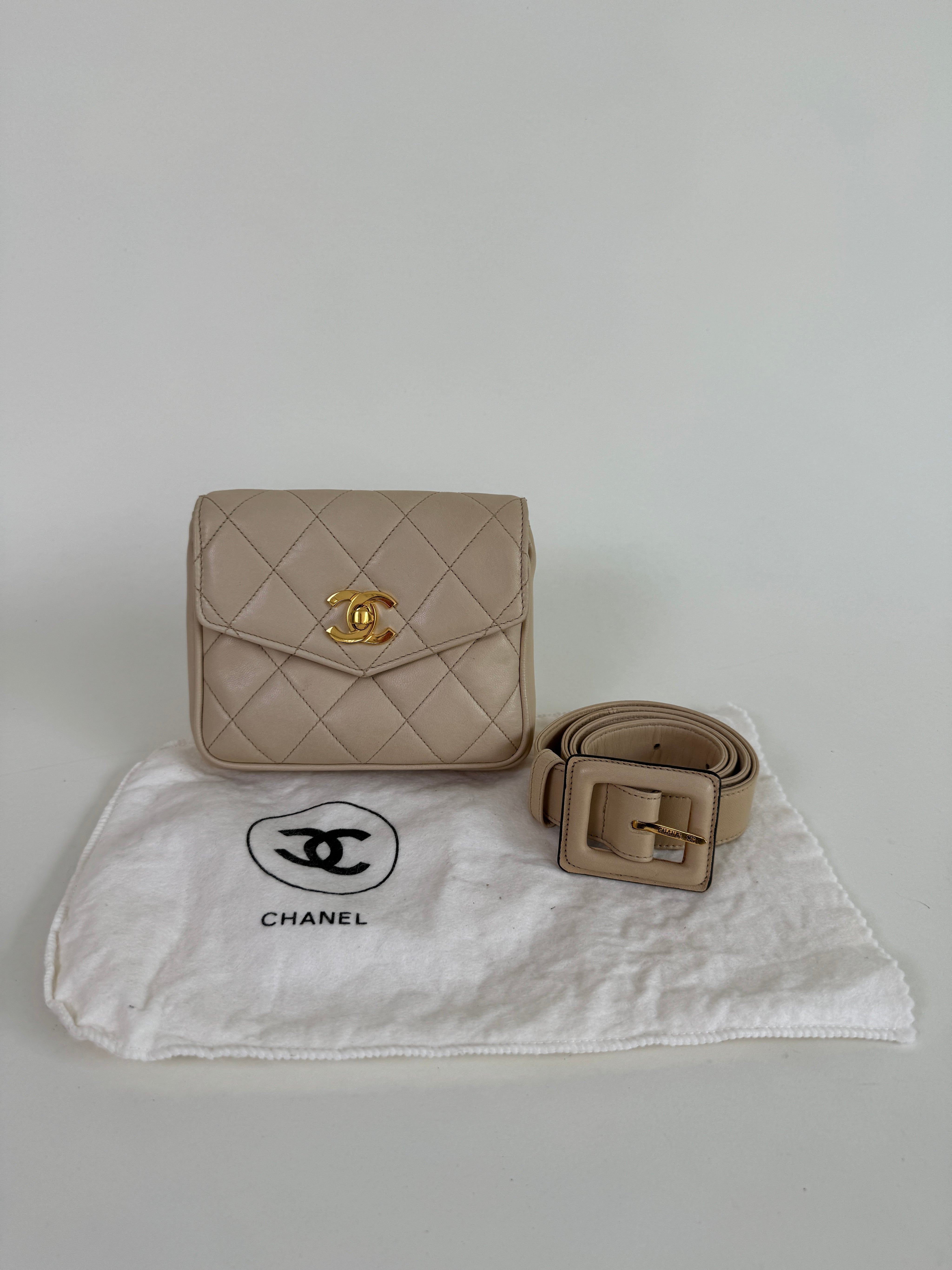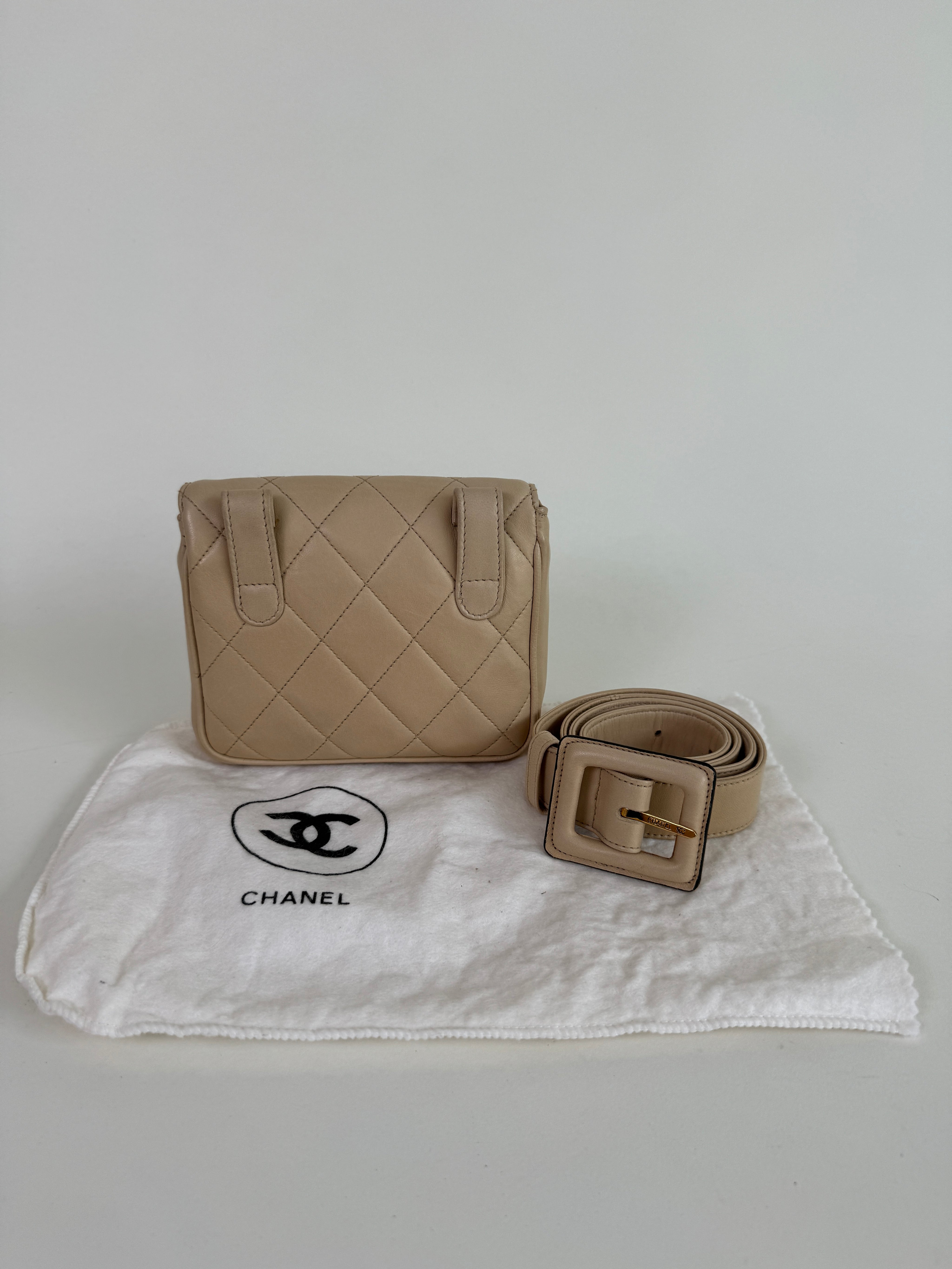 View Similar ProductsFeatures quilted beige leather with flap, CC logo turn-lock closure, and leather belt.