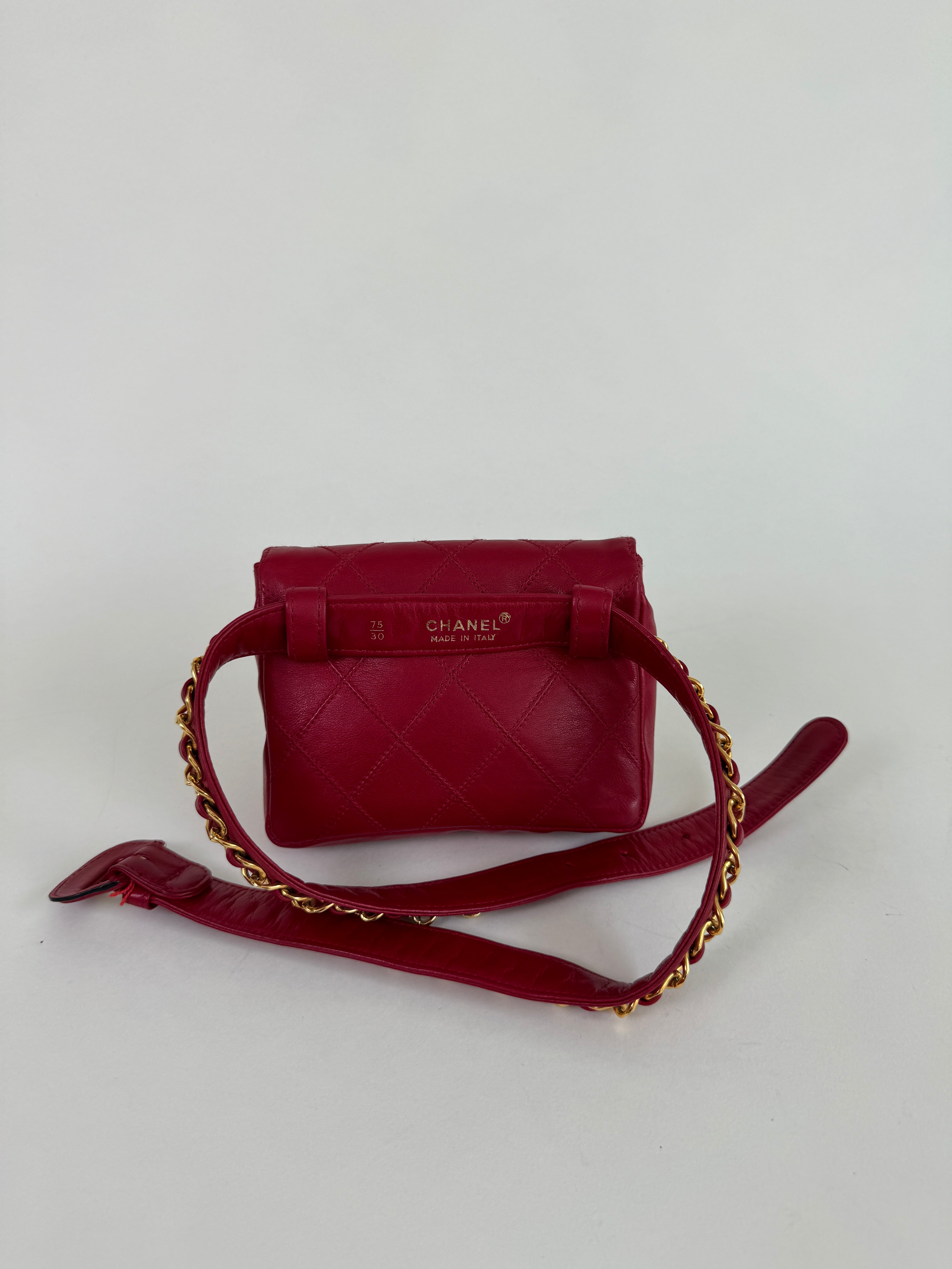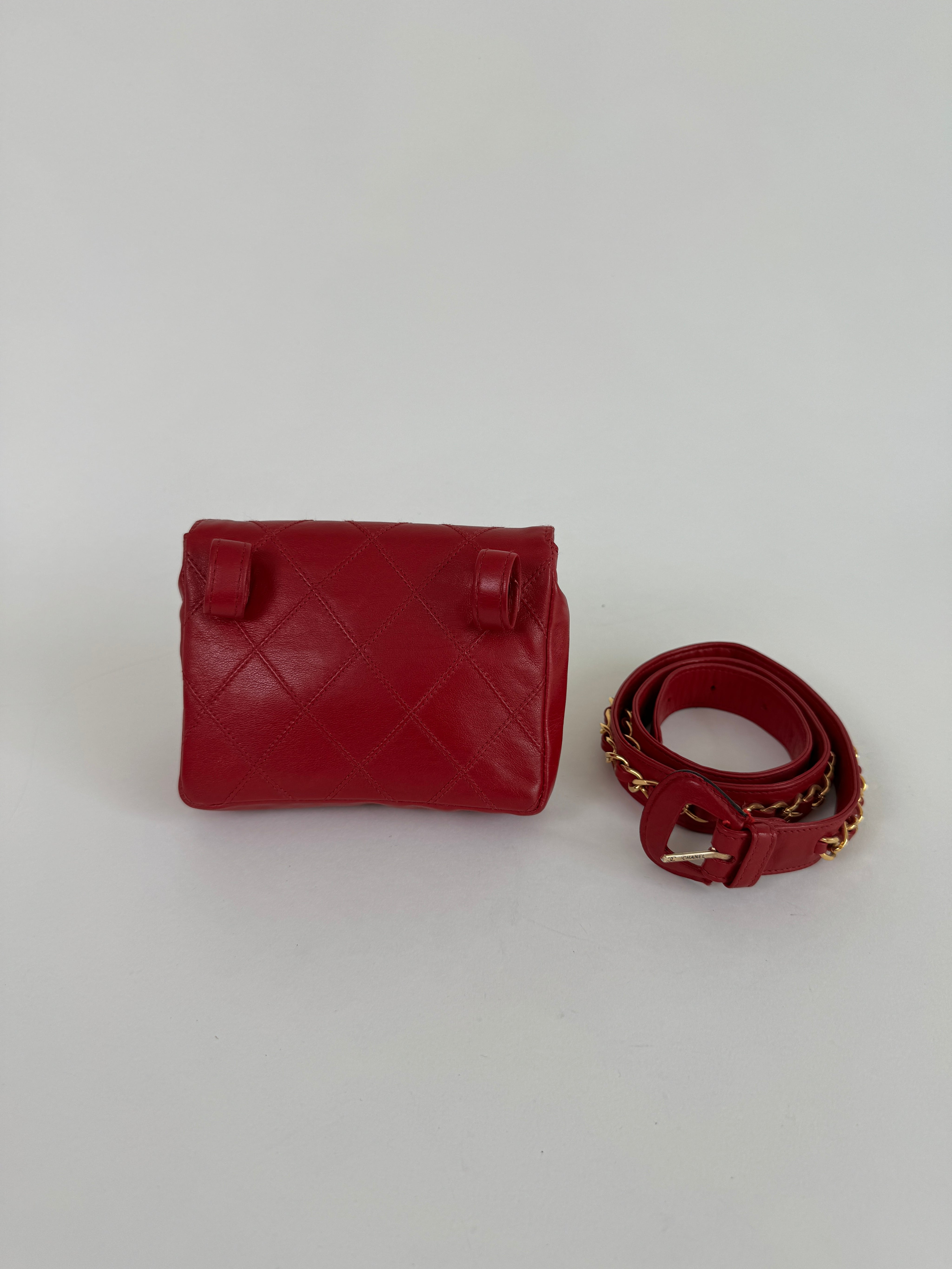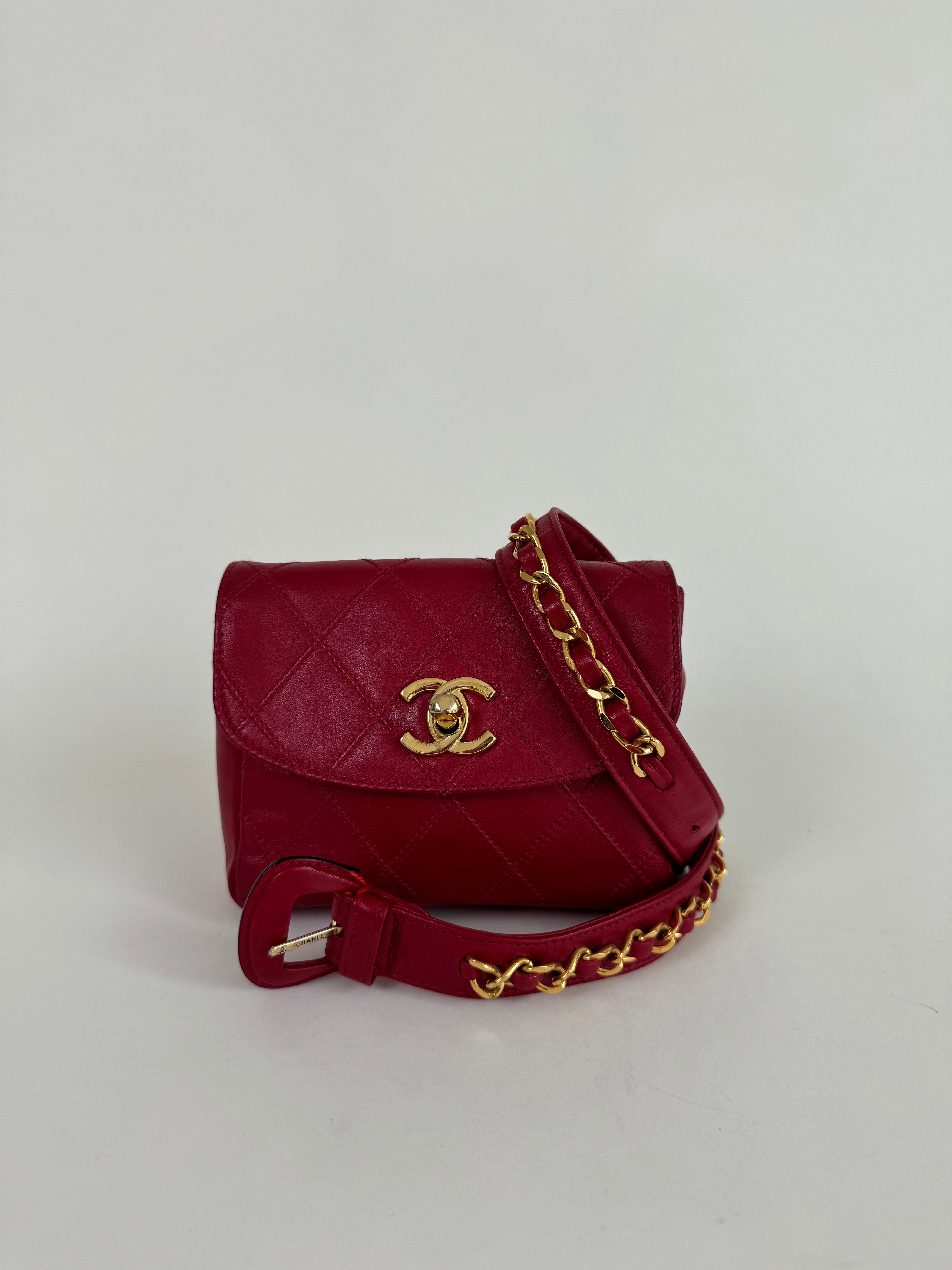 View Similar ProductsFeatures quilted red lambskin leather with flap, CC logo turn-lock closure, and chain-link belt.