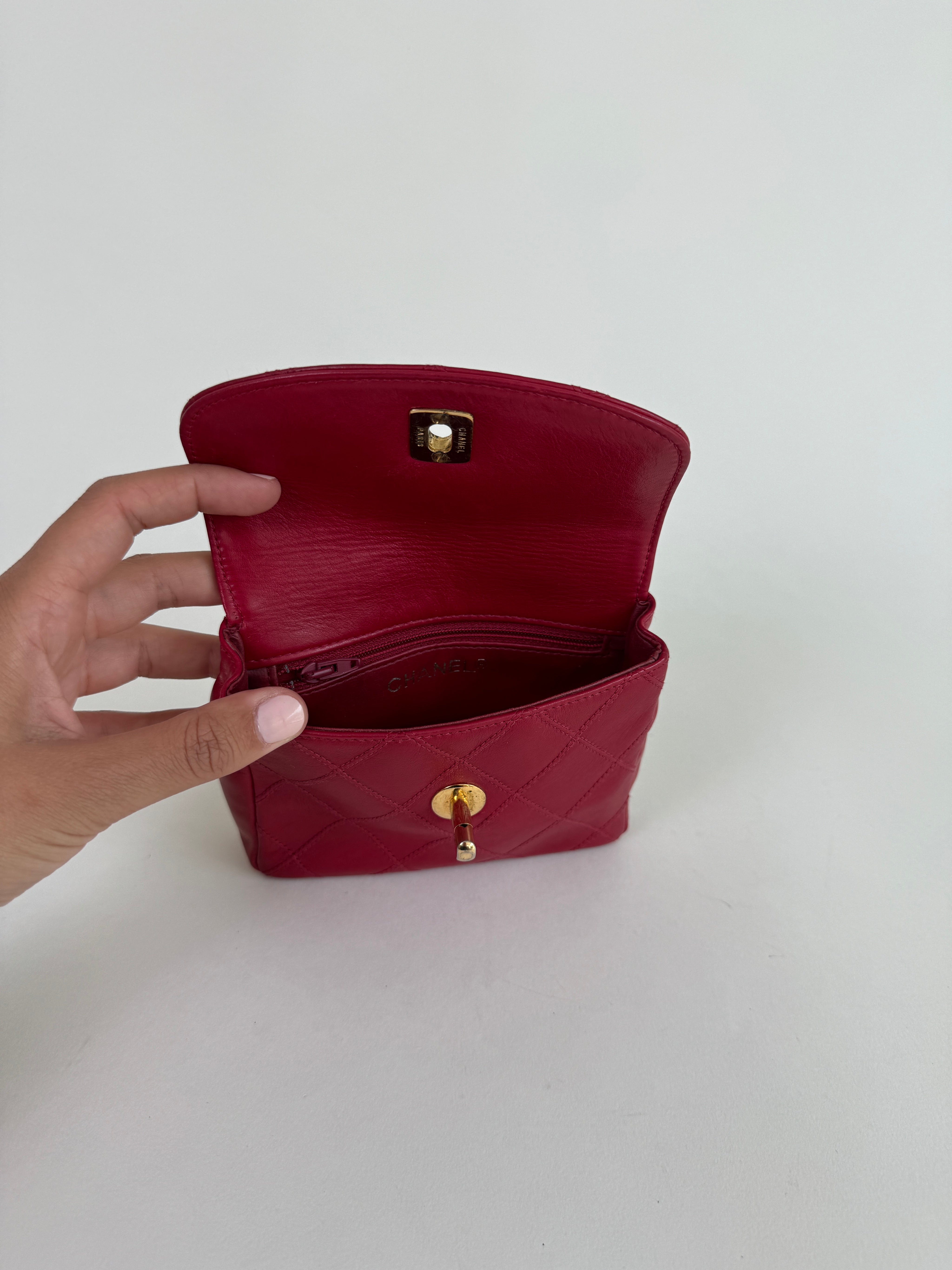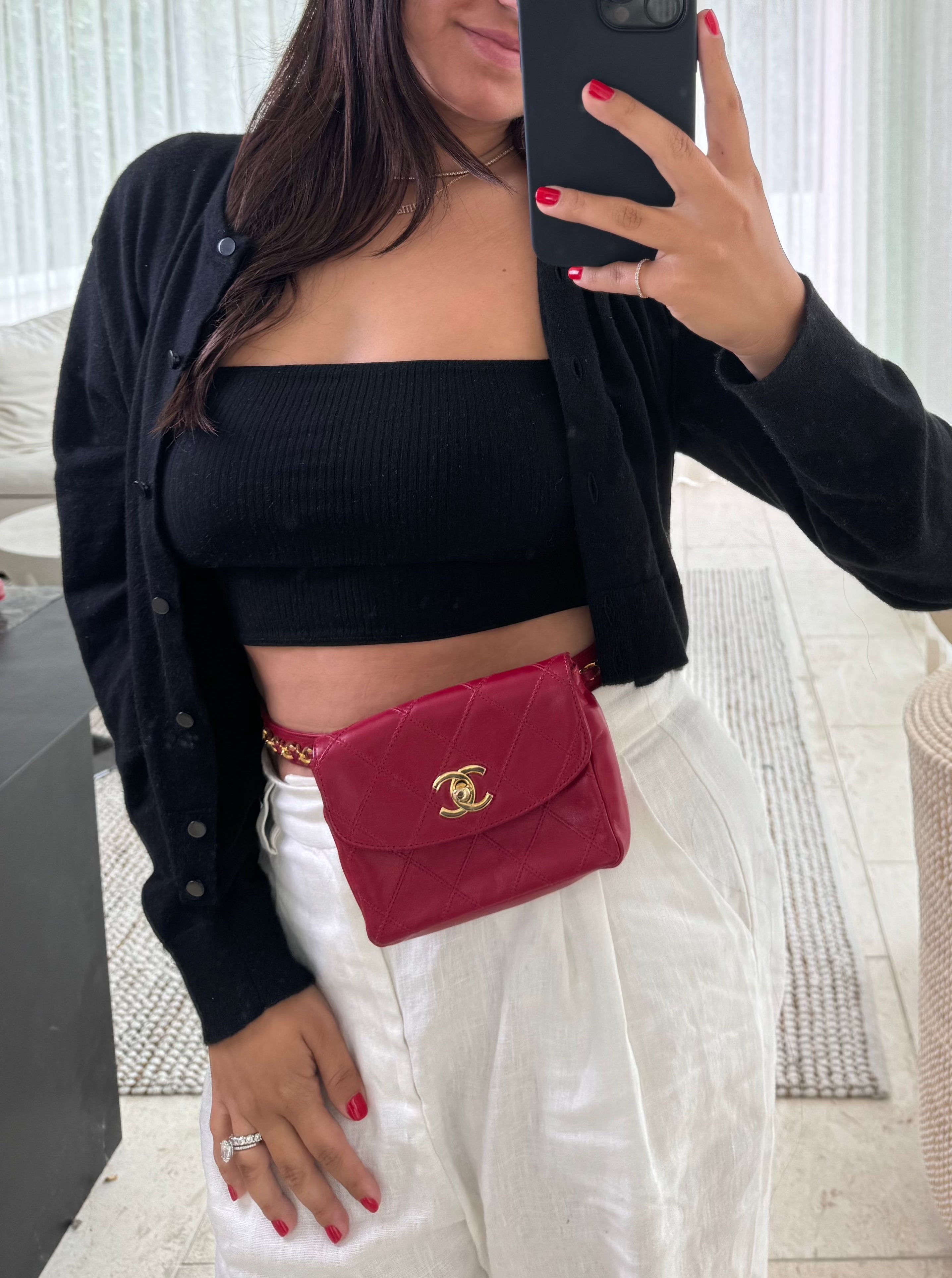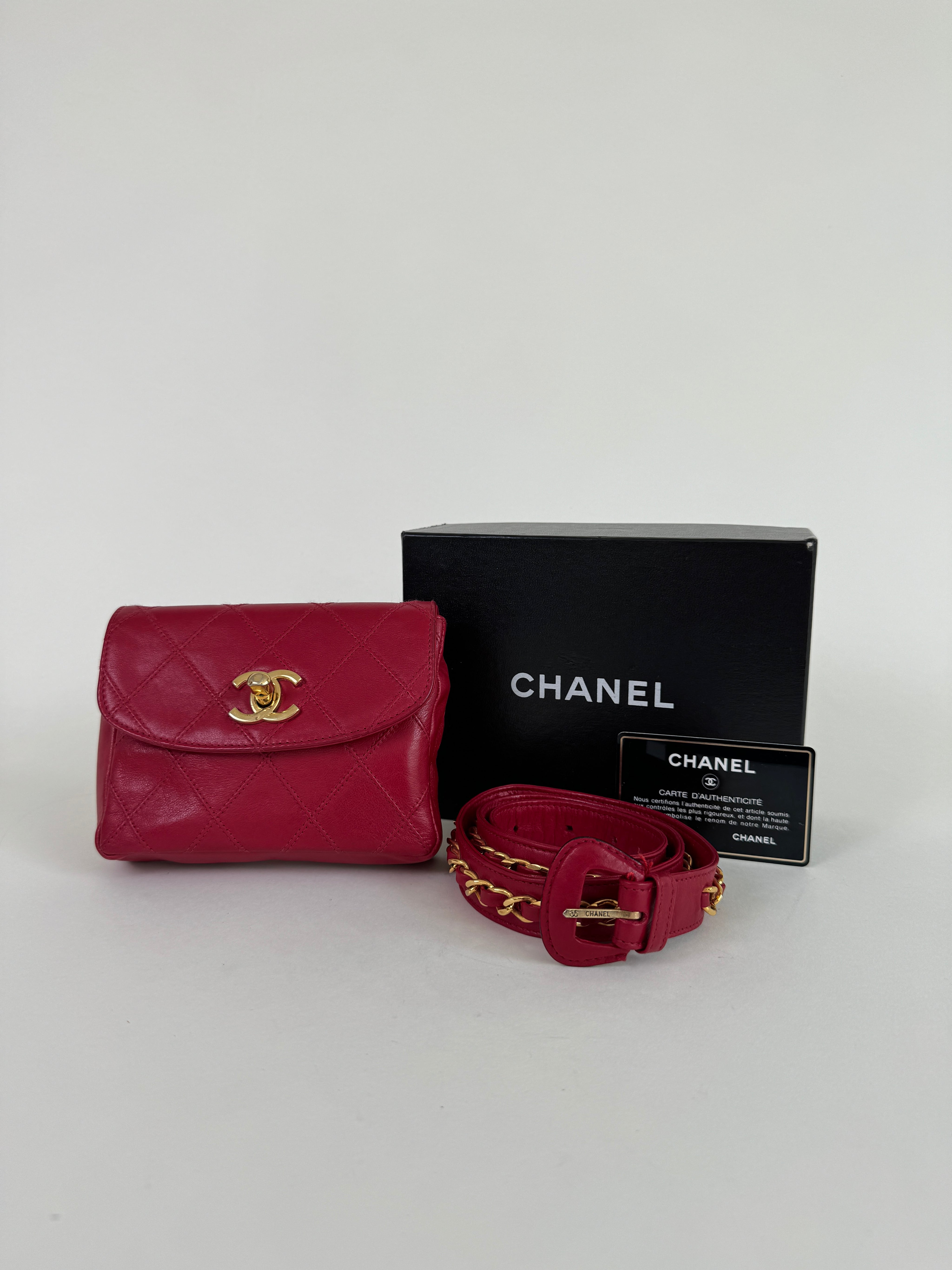 View Similar ProductsFeatures quilted red lambskin leather with flap, CC logo turn-lock closure, and chain-link belt.