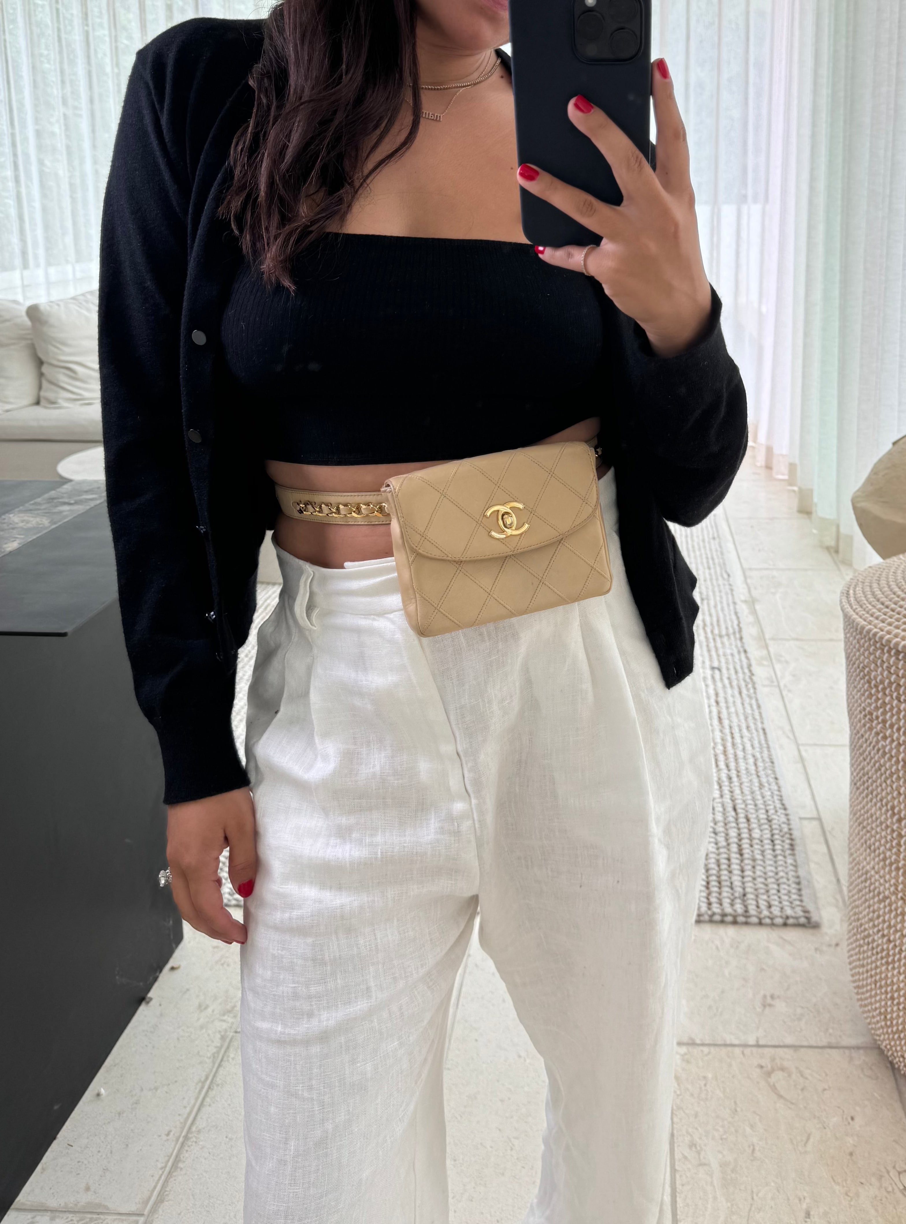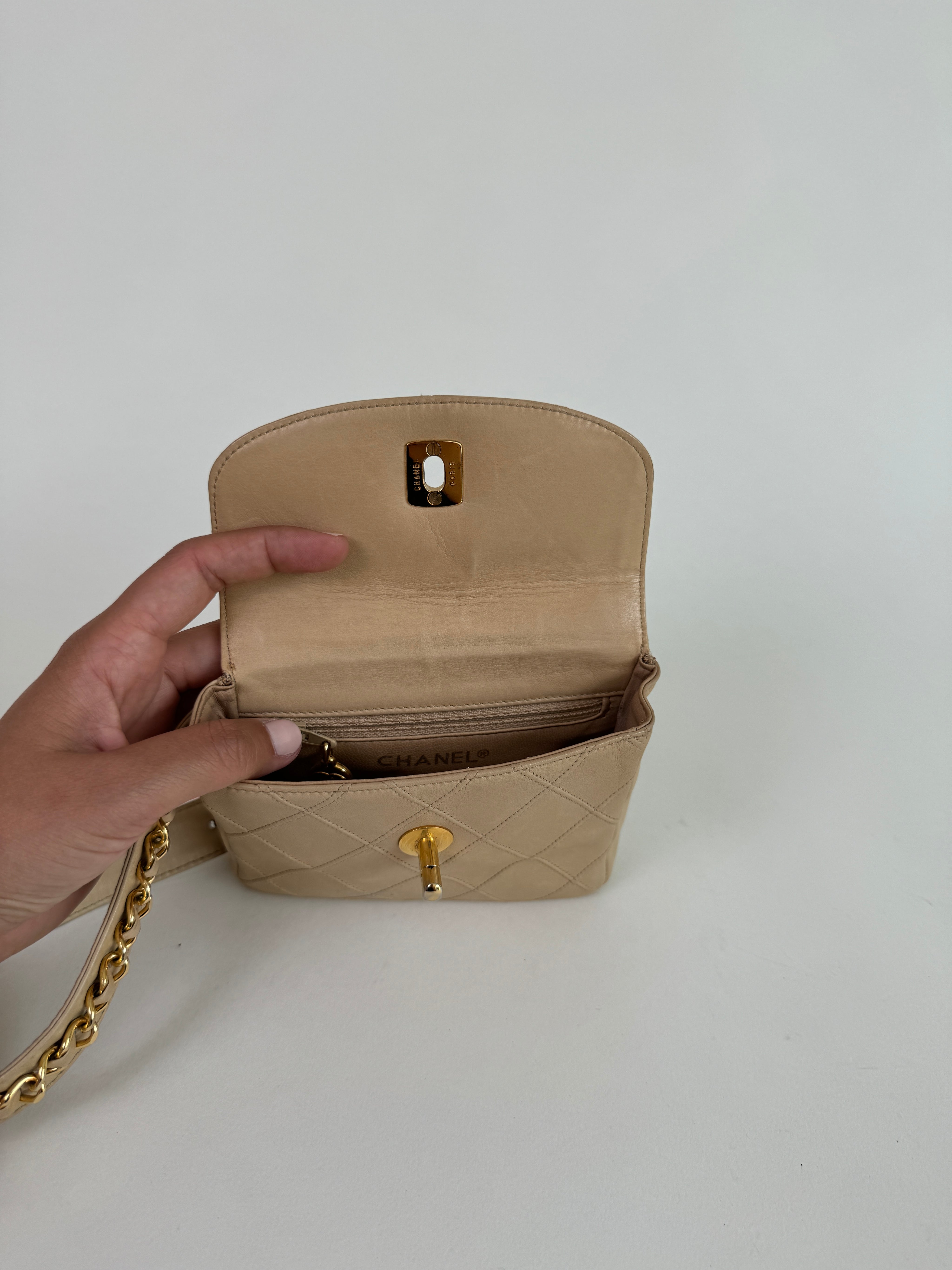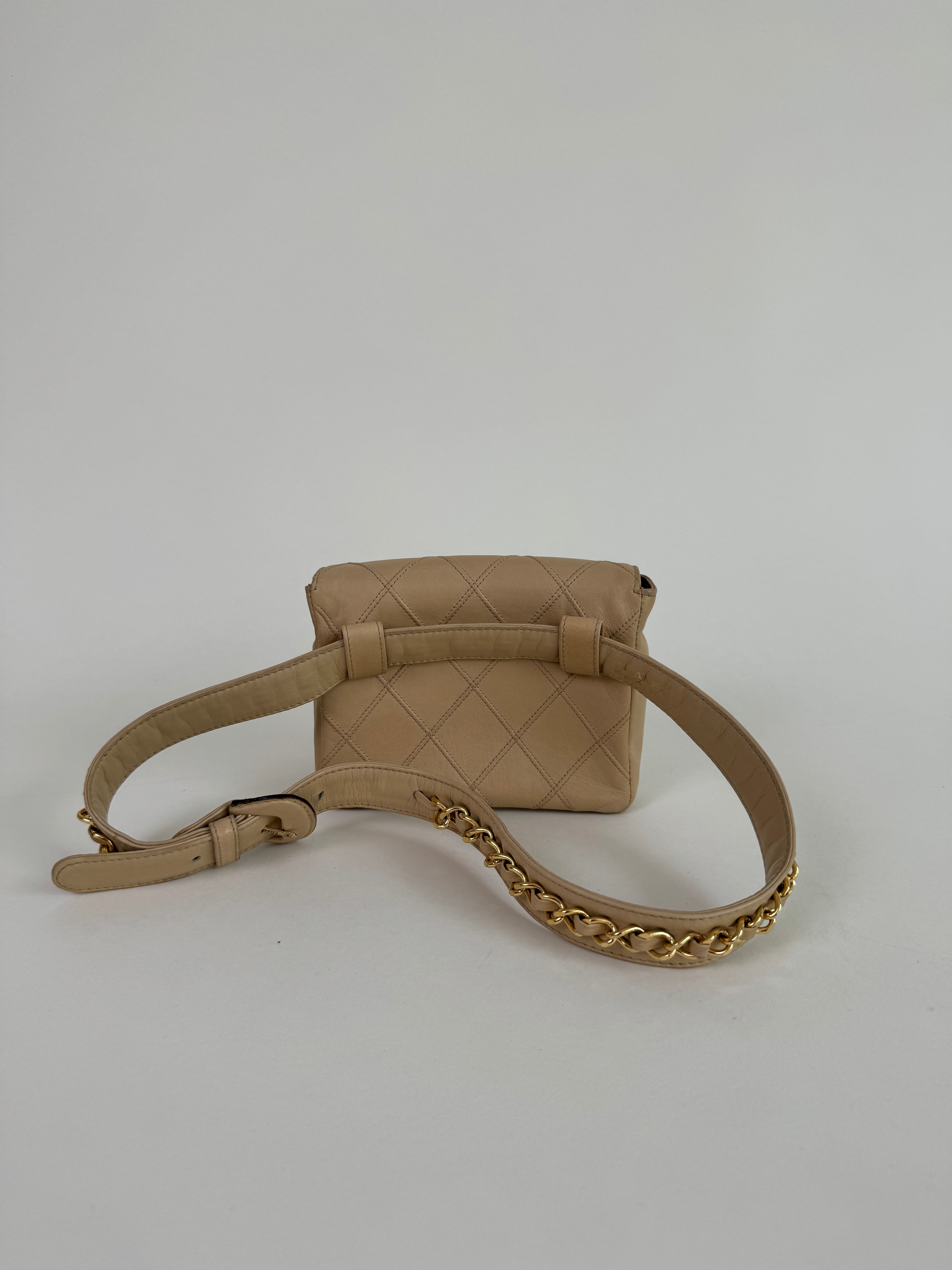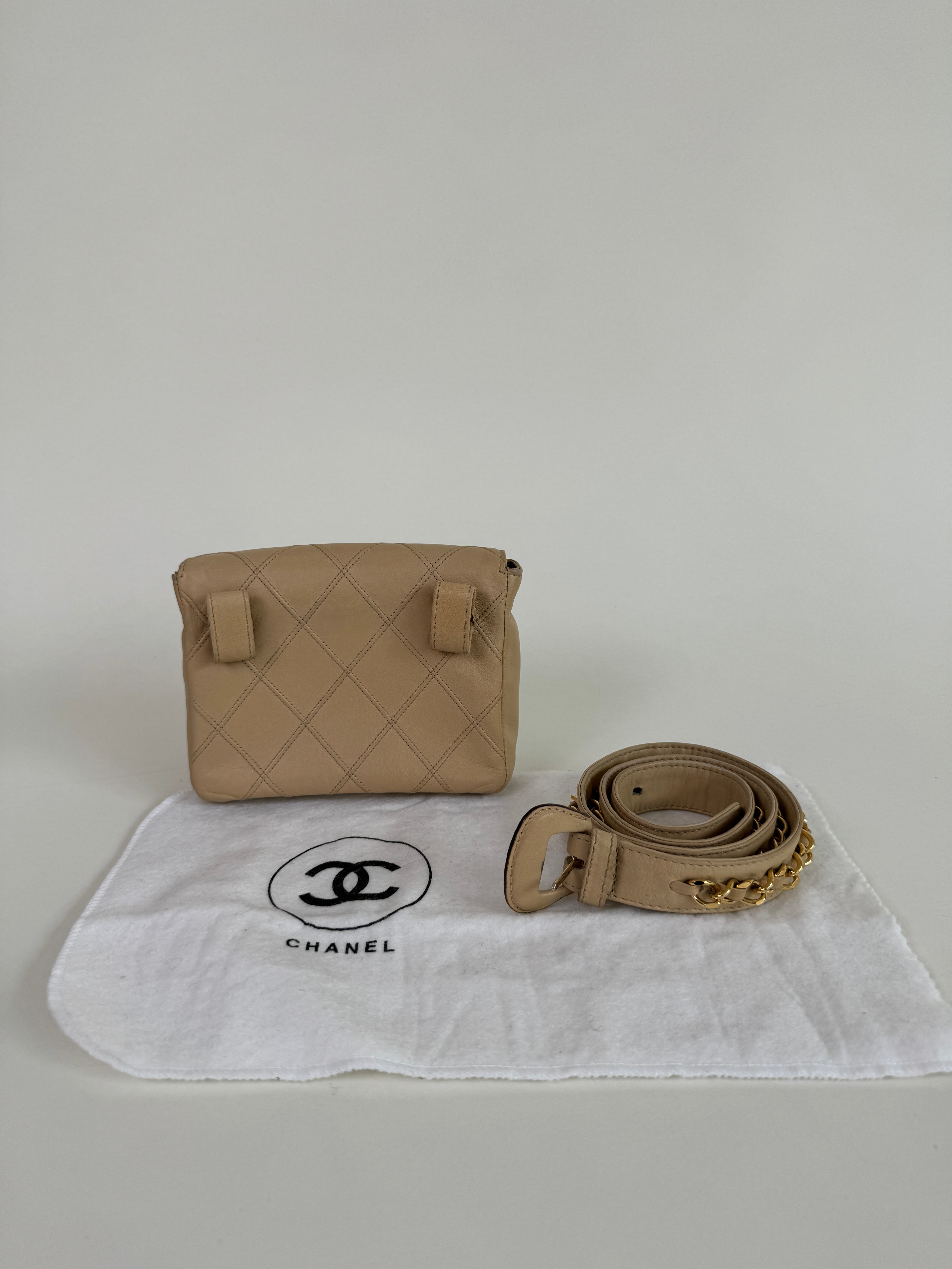 View Similar ProductsFeatures quilted tan lambskin leather with flap, CC logo turn-lock closure, and chain-link belt.