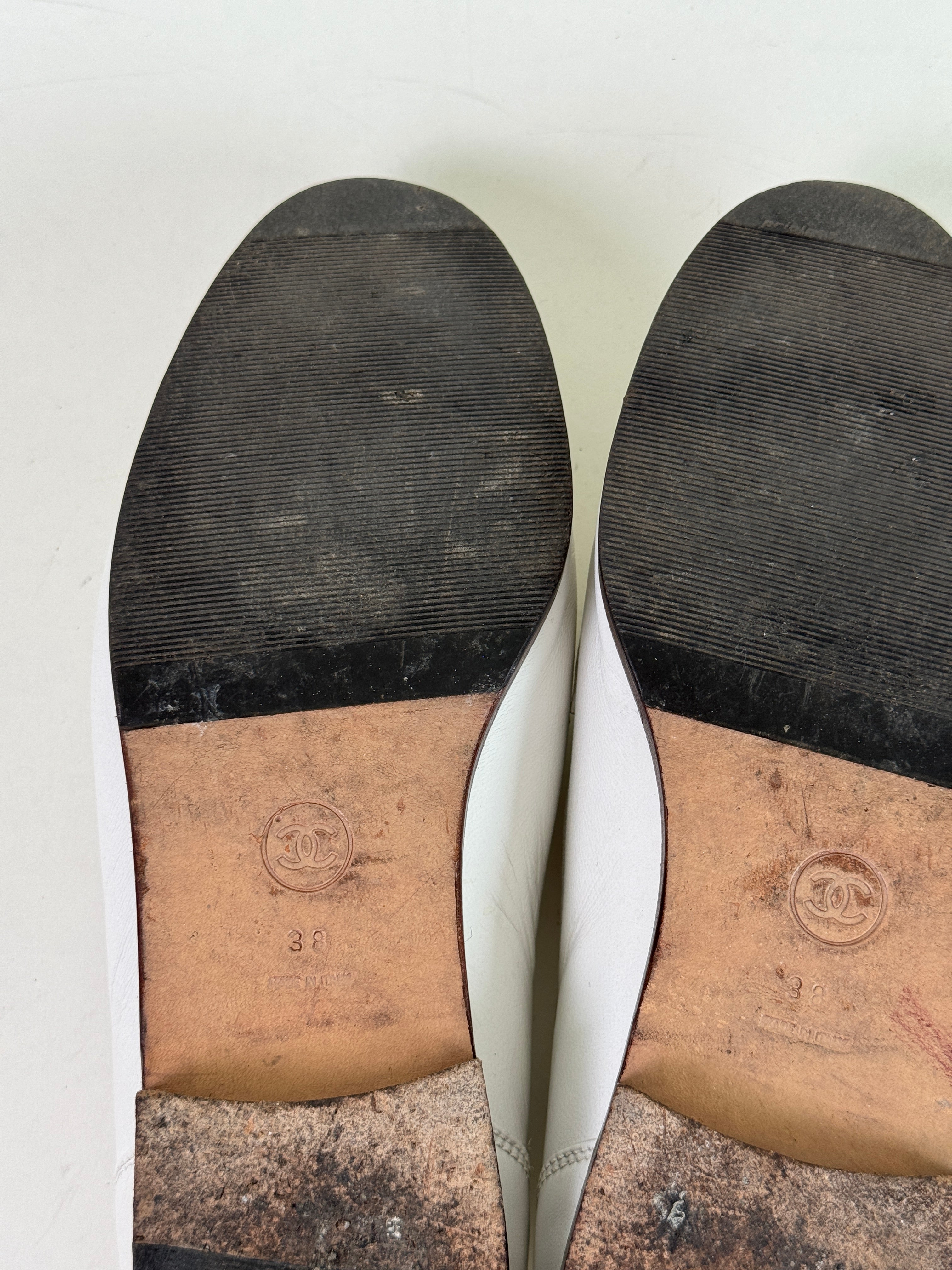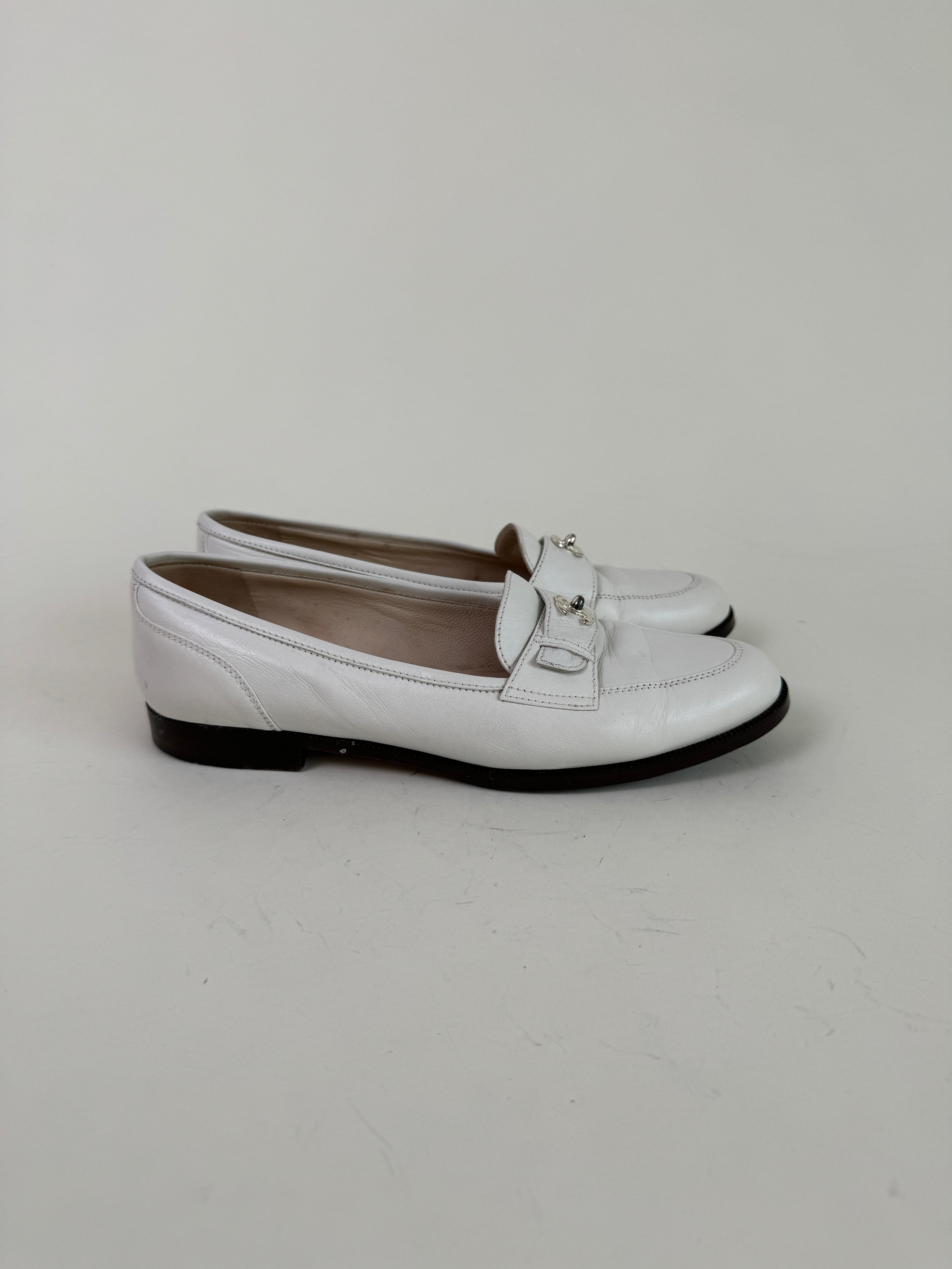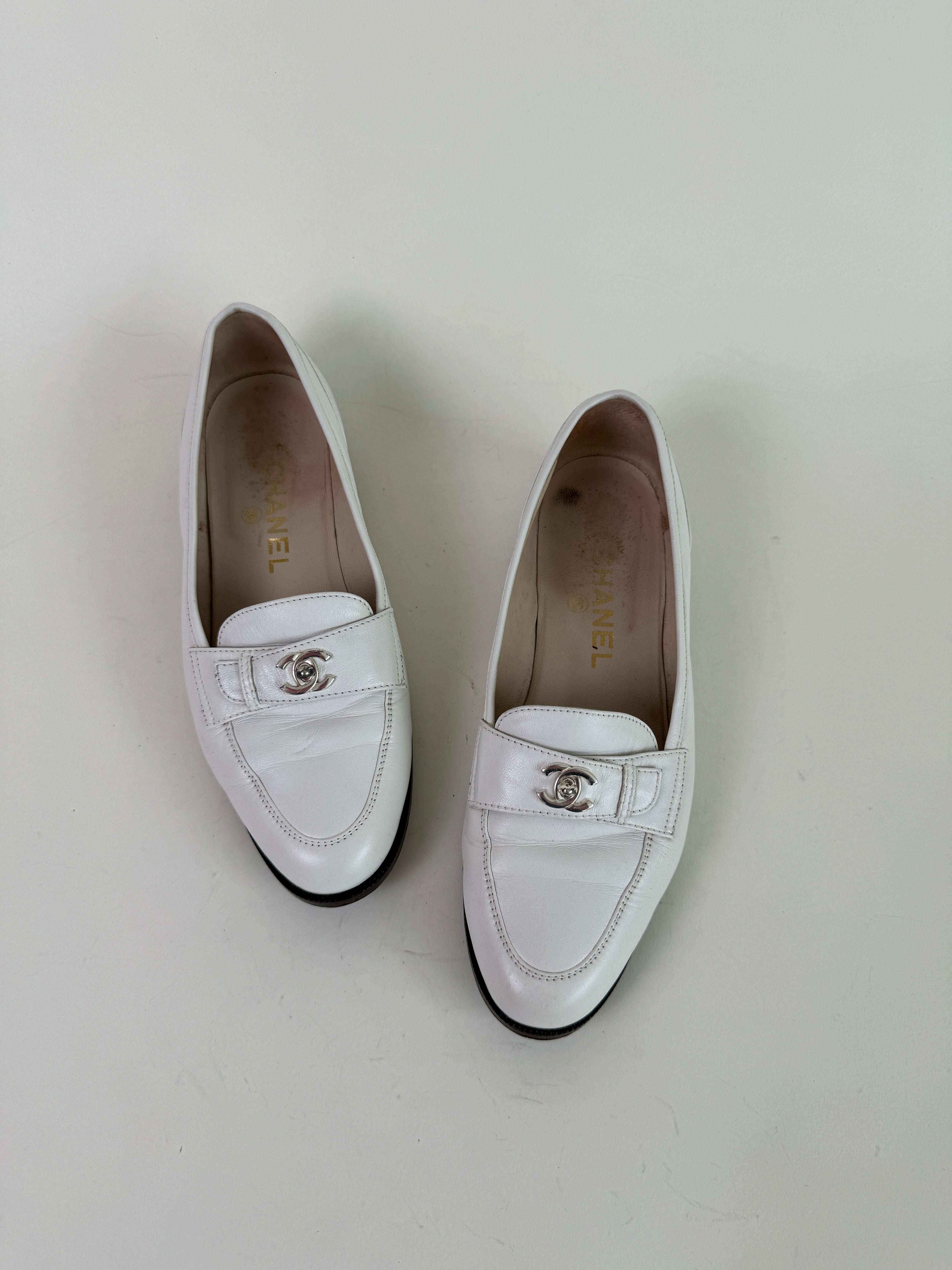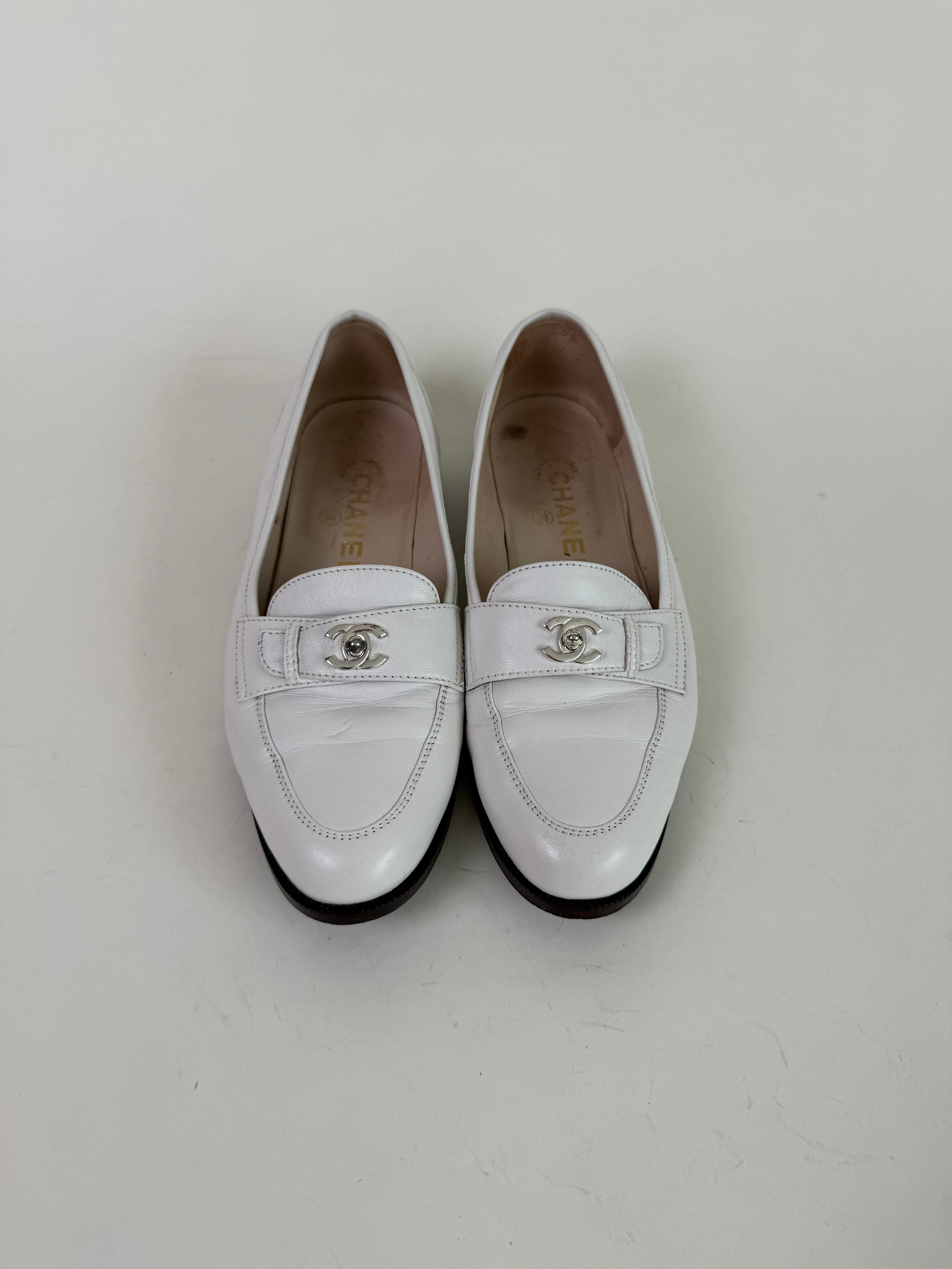 View Similar Products1996 Chanel Bianco Calfskin Leather Interlocking CC Logo Loafers